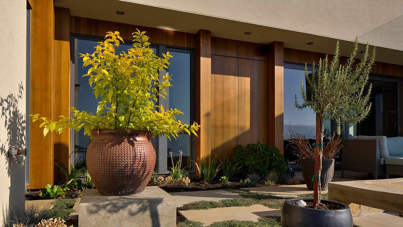 This home is located in West Kelowna in Central British Columbia on a site that overlooks both vineyards and Okanagan Lake. The lot has an easement across the front to allow access to the adjacent lot that sets the house further back on the property requiring the garage to be entered from the side. As a result the house takes the shape of a “U” creating a courtyard for the main entry of the house framed by the detached garage and the main part of the house.